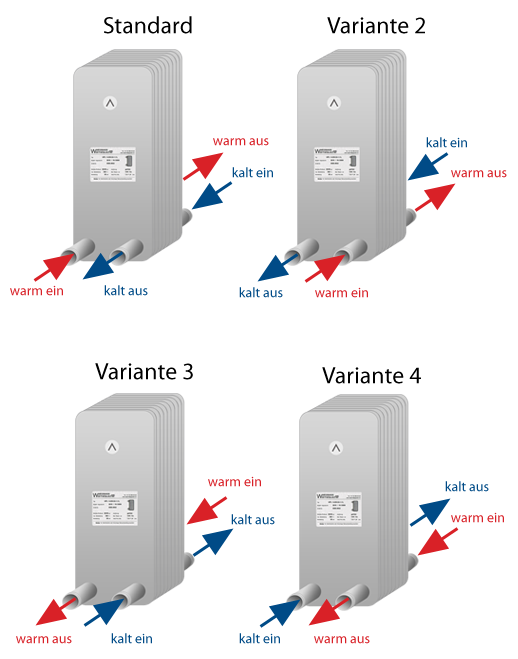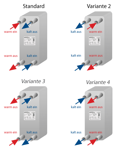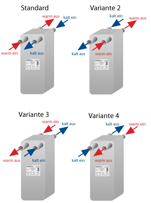 Die zwei Medien müssen immer im Gegenstrom zueinander fliessen. Dies ist bei den gezeigten Anschlussvarianten gewährleistet.